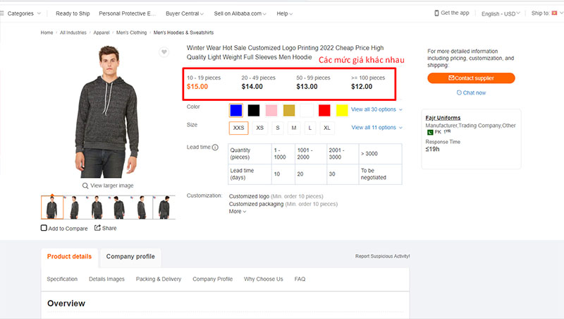 Hầu hết nhà cung cấp trên Alibaba đều công khai giá sỉ/lẻ theo 2–4 khung giá khác nhau. Mỗi khung sẽ ghi rõ mức số lượng tối thiểu bạn cần nhập để được hưởng đơn giá tương ứng.