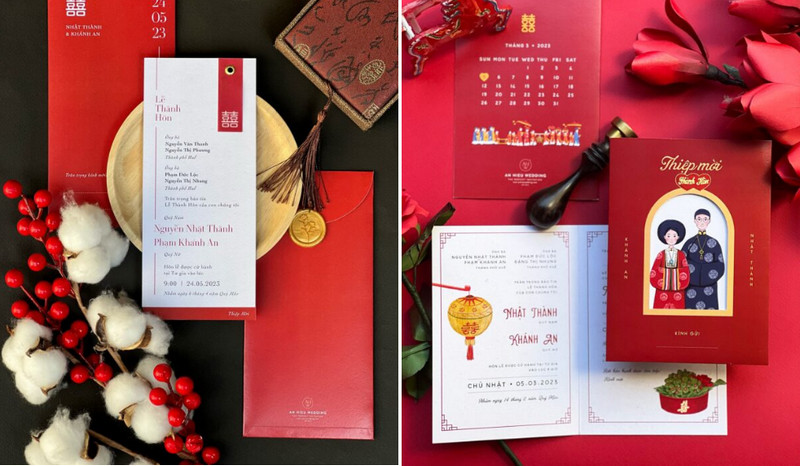 Nền đỏ, họa tiết rồng phượng, hoa sen, chữ song hỷ hoặc chữ Hán thư pháp, nhưng được thiết kế lại với bố cục thoáng hơn, font chữ hiện đại hơn, màu đỏ dịu hơn chứ không chói. Nhiều mẫu còn phối giấy đỏ với các chi tiết kim loại, ruy băng, hoặc bìa cứng dập nổi, tạo cảm giác rất “premium”, hợp với những cặp đôi muốn vừa giữ nét Á Đông, vừa có chất “sang – hiện đại”.