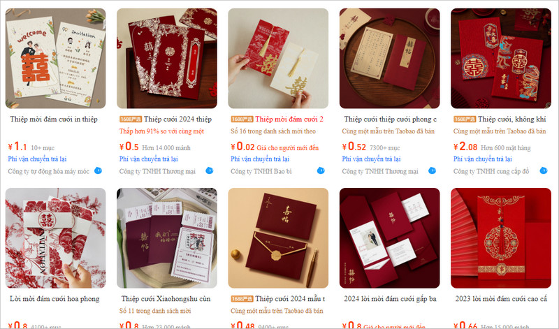 Hiện tại, kênh được nhiều người kinh doanh thiệp cưới lựa chọn nhất vẫn là order trên sàn TMĐT nội địa Trung như Taobao, 1688, Tmall. Ưu điểm thì khá rõ: mẫu mã cực đa dạng, từ siêu rẻ đến cao cấp; giá niêm yết rõ ràng, dễ so sánh; nhiều shop thường xuyên chạy khuyến mãi theo mùa cưới, sự kiện; và bạn có thể ngồi ở Việt Nam vẫn xem được hàng trăm thiết kế chỉ trong vài tiếng.