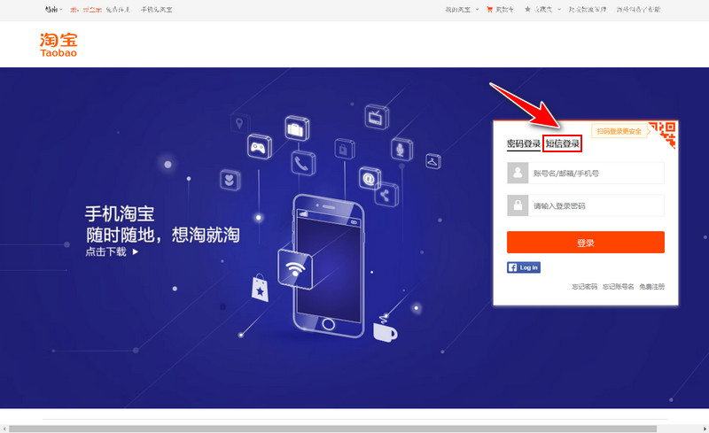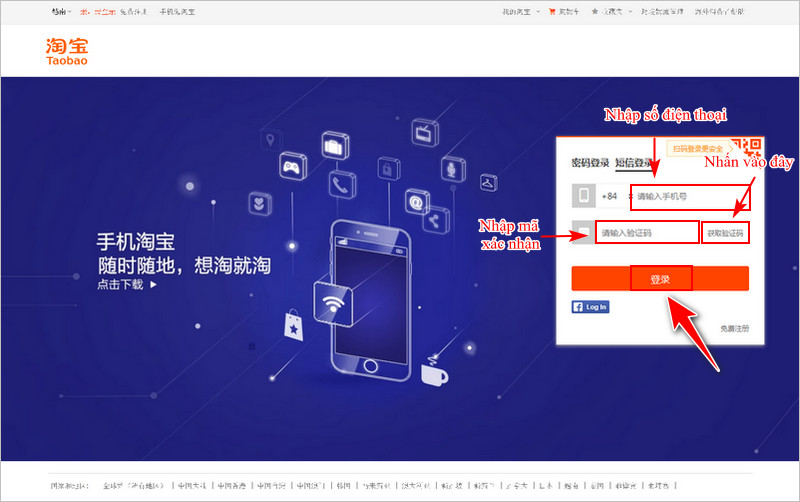 Tiếp đó, hãy click vào “短信登录” như hình để có thể đăng nhập bằng số điện thoại.