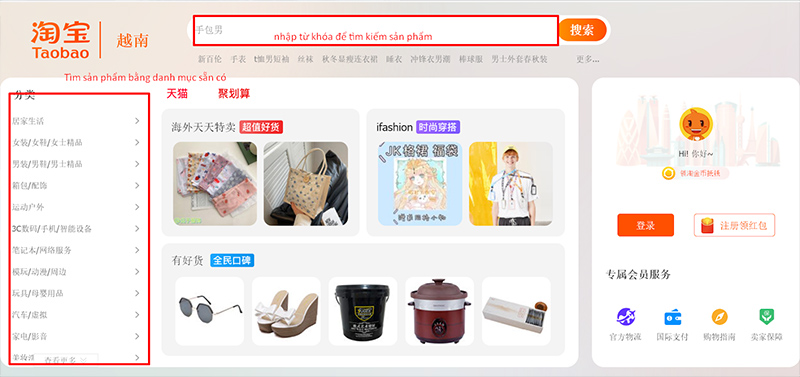 Bạn có 2 cách chính để tìm kiếm sản phẩm trên Taobao.