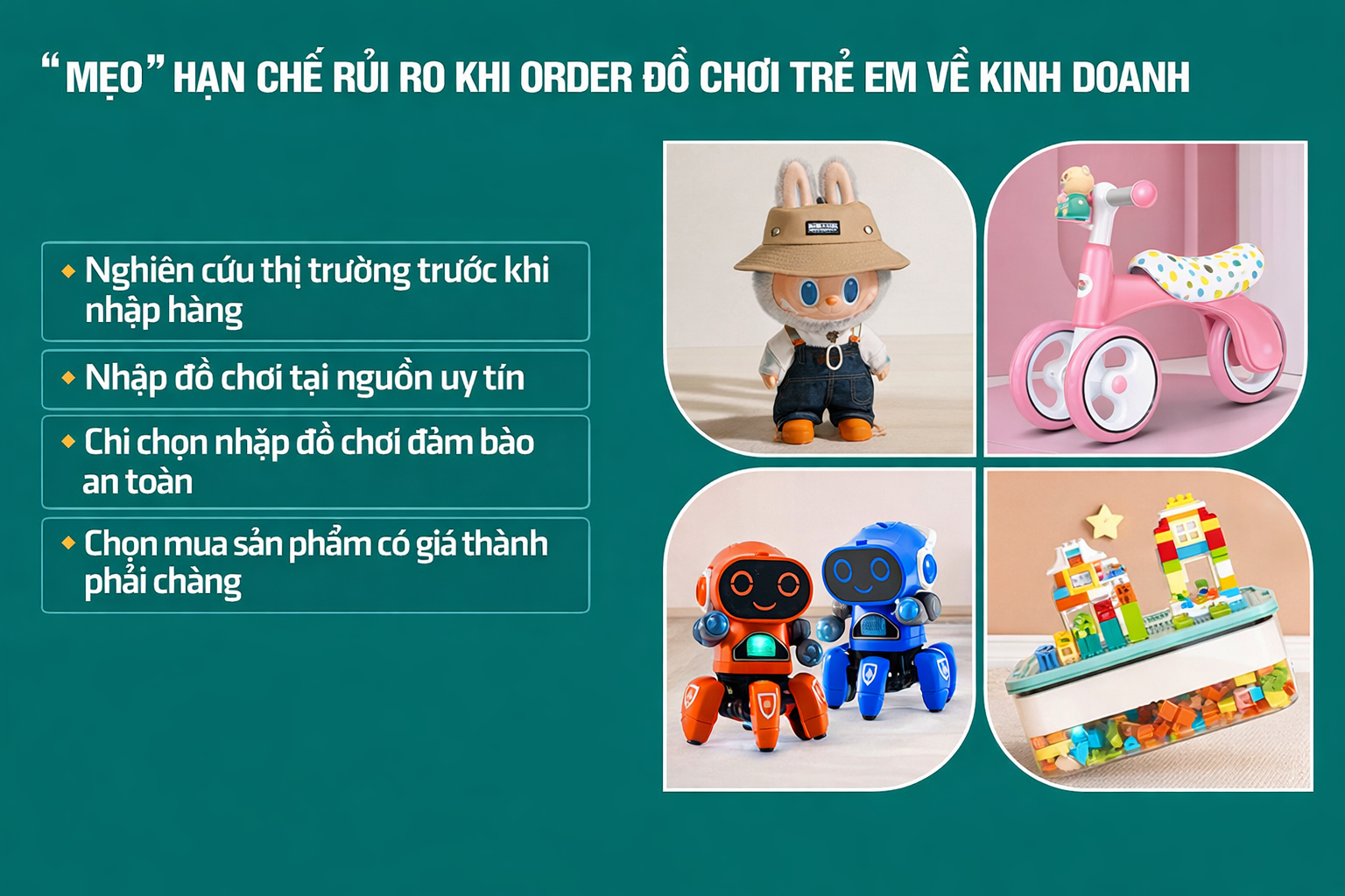 Đặc biệt, chỉ nên nhập các sản phẩm đảm bảo an toàn, không chứa chất độc hại, không có cạnh sắc nhọn. Đây là tiêu chí quan trọng để xây dựng uy tín lâu dài cho cửa hàng.