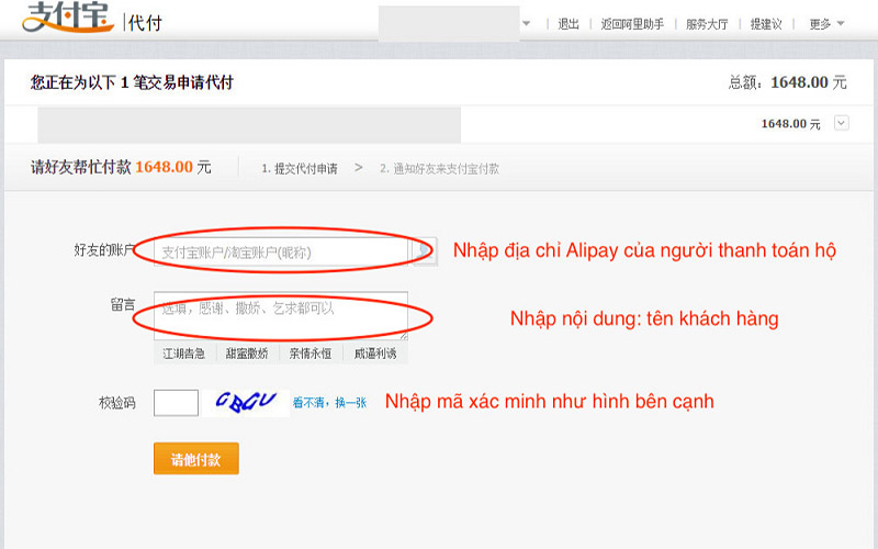 Nhập số tài khoản Alipay của người nhờ thanh toán hộ và click vào ô màu cam phía dưới cùng của màn hình máy tính.