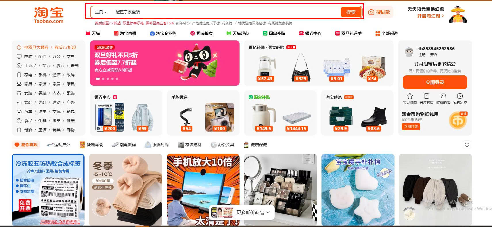 Tìm kiếm sản phẩm cần mua, ở bước này người dùng sẽ tìm kiếm qua từ khóa, danh mục sản phẩm gợi ý. Ngoài ra, có thể tìm kiếm sản phẩm Tmall trực tiếp trên trang web Taobao.