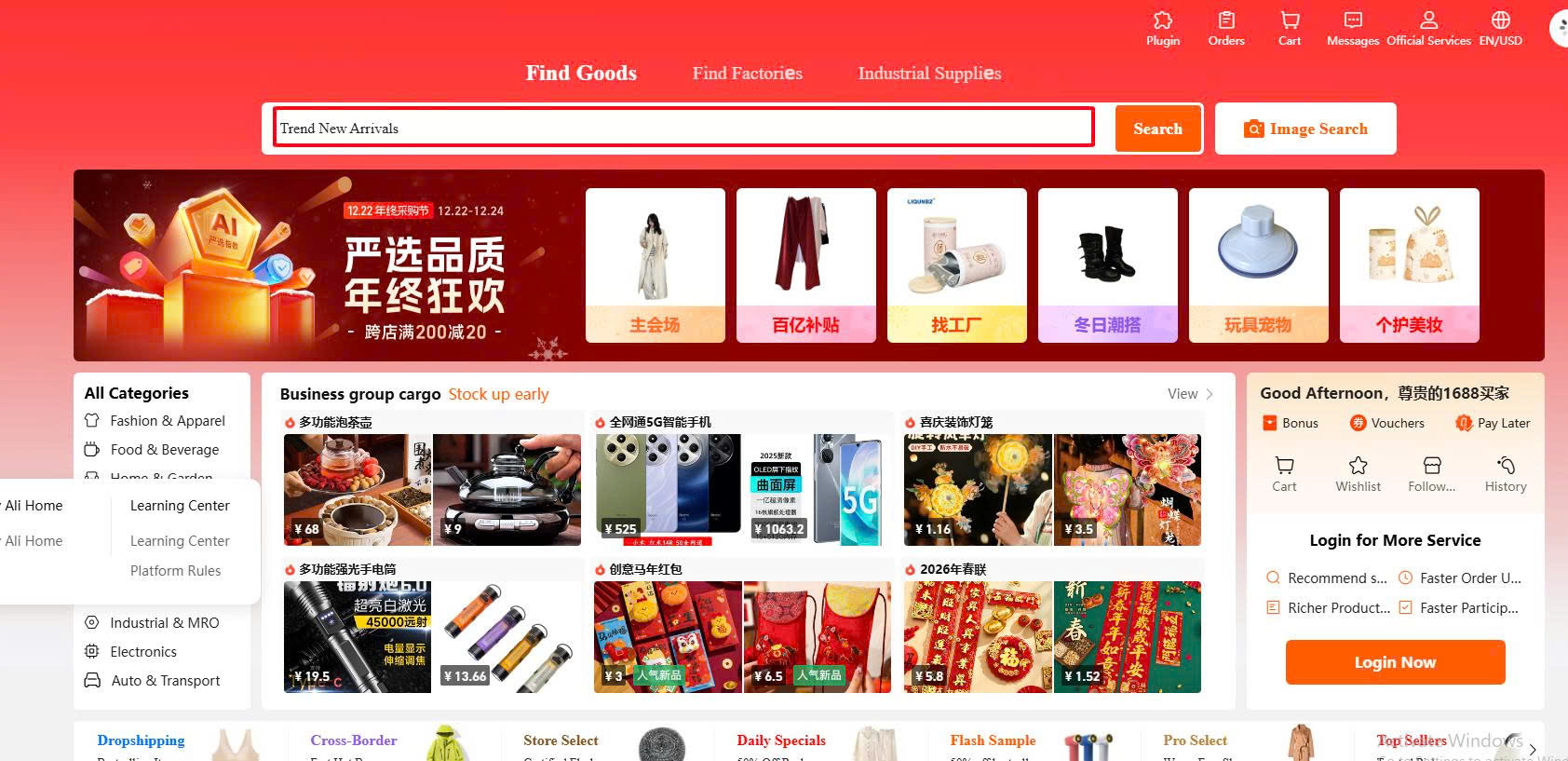 Trước tiên người dùng muốn mua hàng bạn truy cập vào 1688 và đăng nhập tài khoản thành viên.