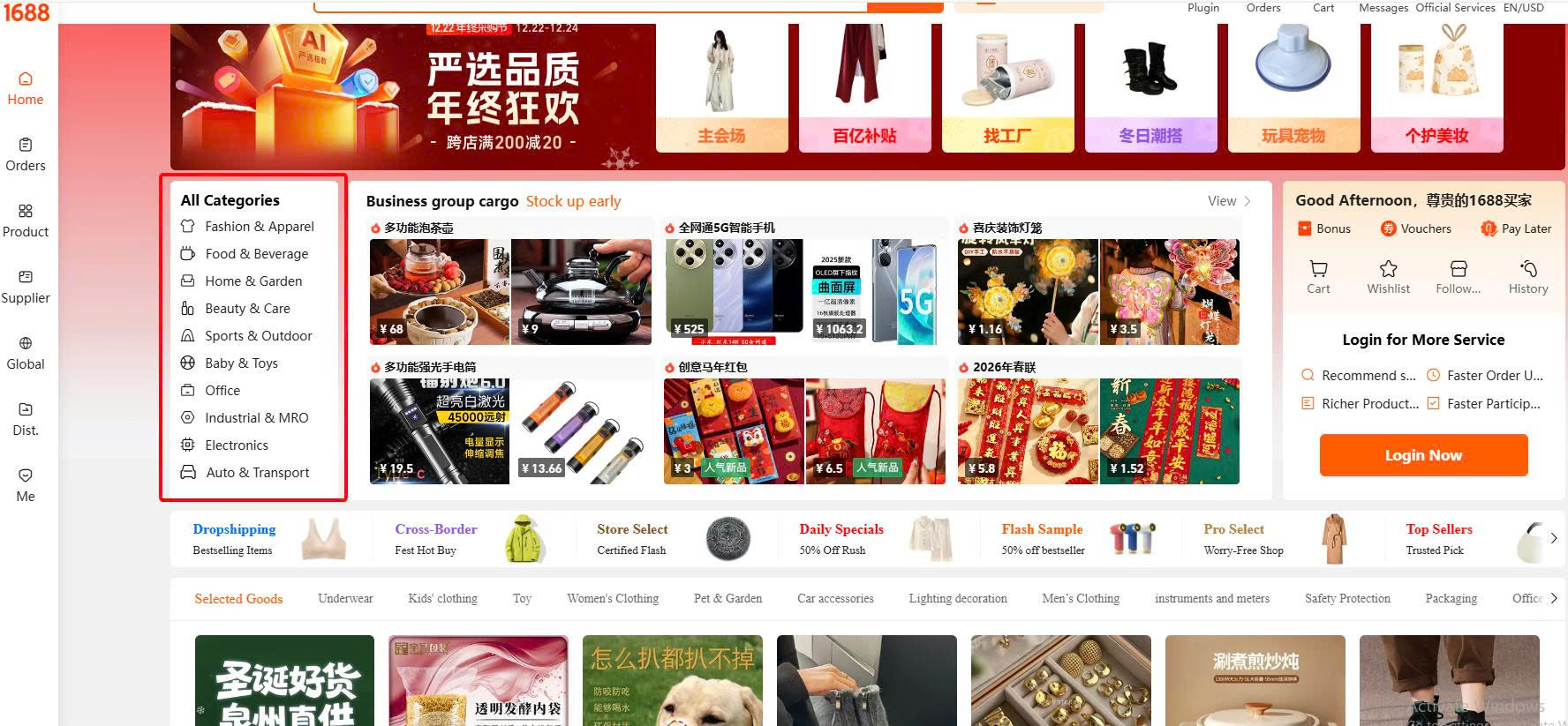 Bên cạnh việc tìm kiếm sản phẩm bằng hình ảnh và bằng từ khóa sản phẩm, bạn có thể tìm bằng cách sử dụng danh mục sẵn có trên cả 3 trang Taobao, Tmall và 1688. Tại trang chủ của 3 trang, bạn sẽ nhìn thấy danh mục sẵn có được gợi ý phía bên tay trái màn hình.