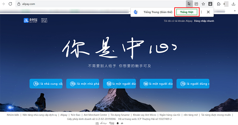 Trước tiên, người dùng truy cập vào ví điện tử Alipay trên máy tính theo địa chỉ https://www.alipay.com/. Lúc này màn hình máy tính sẽ gợi ý chuyển trang web sang tiếng Việt, nếu đồng ý bạn bấm chọn chuyển đổi để tiếp tục.