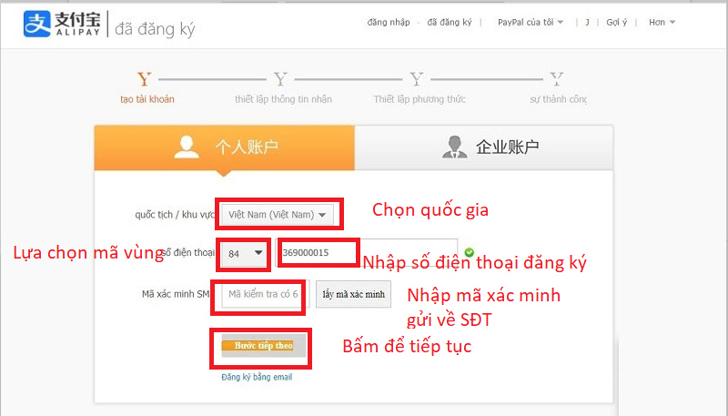 Trên giao diện đăng ký tài khoản Alipay, người dùng lựa chọn khu vực đăng ký là “Việt Nam”, chọn mã vùng của Việt Nam là “+84” và nhập số điện thoại. Sau khi nhập xong thông tin, hệ thống sẽ gửi một mã xác minh về số điện thoại vừa nhận, bạn nhập mã code để xác minh tài khoản.