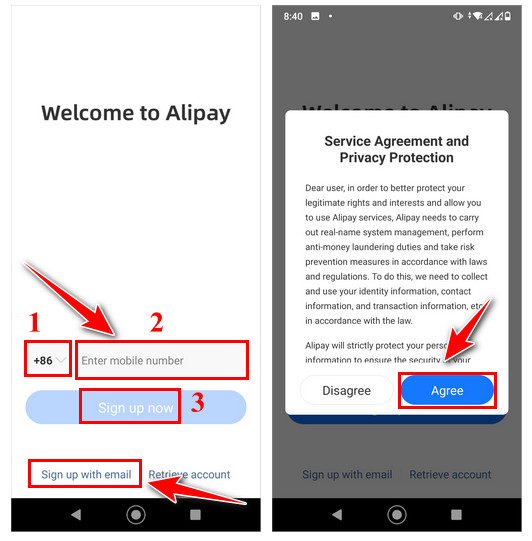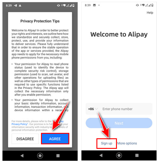 Khi cài đặt app Alipay xong, bạn mở ra và nhấn vào Agree ở phía dưới giao diện để đồng ý các điều khoản. Tiếp đó, nhấn “Sign up”.