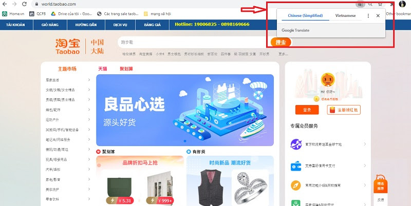 Dịch toàn bộ giao diện website bằng Chrome hoặc Cốc Cốc: trình duyệt tự gợi ý “Dịch sang tiếng Việt” khi vào Taobao/1688, bạn chỉ việc bấm chọn.