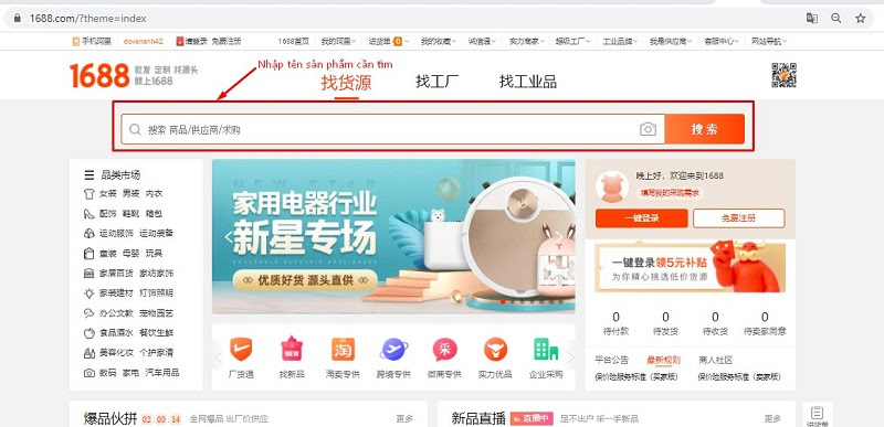Tìm bằng từ khóa: hiệu quả nếu bạn biết chính xác tên gọi sản phẩm bằng tiếng Trung. Ví dụ: “连衣裙” (đầm liền), “收纳盒” (hộp đựng đồ)…