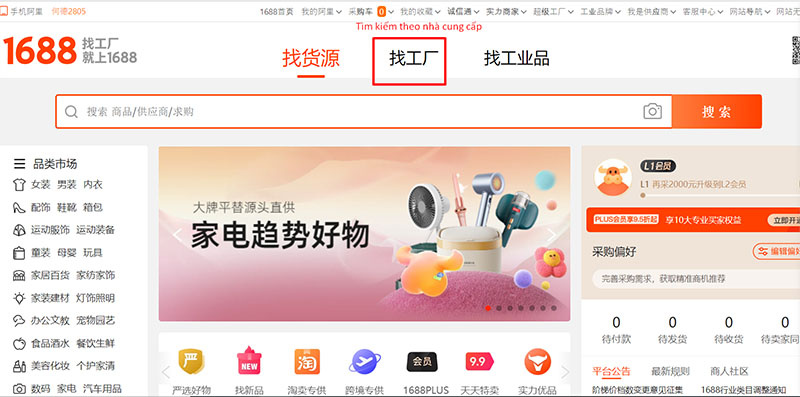 Khi muốn tìm xưởng sản xuất uy tín trên 1688, các chủ shop, nhà buôn thực hiện theo các bước như sau: